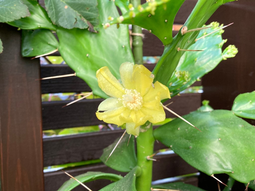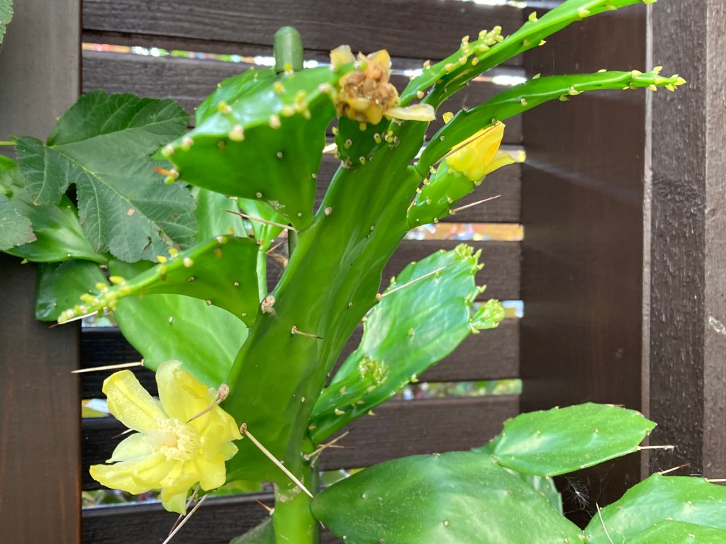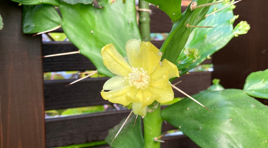 Tämän Brasilian opuntian historia ulottuu liki sadan vuoden taakse. Piikikäs kaunotar on istutettu ensimmäisen kerran ruukkuun viimeistään vuosien 1920-1950 välillä, ellei jo aiemmin. Se ehti olla vuoden päivät ypöyksin kotonaan ennen kuin se ojennettiin minulle. Edellinen omistaja oli ollut huolissaan ja uskonut rakkaan kasvinsa jo menehtyneen sen jälkeen, kun hän joutui pysyvästi sairaalahoitoon. Surkeana tämä minulle tulikin, mutta heräsi hitaasti uuteen kukoistukseen. Parinkymmenen vuoden odotus palkittiin, ja opuntia on nykyisin yksi silmäteristäni, talvisin sisällä ja kesäisin ulkona. Olen uudistanut sitä leikkaamalla pari latvusta ja istuttamalla ne ruukkuun. Uuden kasvun ansioista ruukussa kasvaa kolme eri ikäistä runkoa. Niistä vanhin yllätti iloisesti näinä lämpimänkosteina syyskesän päivinä. Yksi kukka on jo lakastunut, yksi oli auennut ja kolmas on nupussa tulollaan.