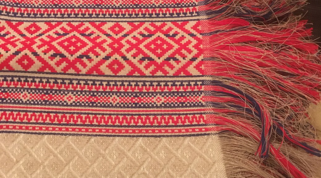 Artikkelin otsikkokuva: Yksityiskohta pöytäliinasta, Helmi Vuorelma (valmistajan kangasetiketti puuttuu), pellava, hapsut, kareliaaninen kirjailu punaisella ja sinisellä, kuva: Tuija Peltomaan arkisto